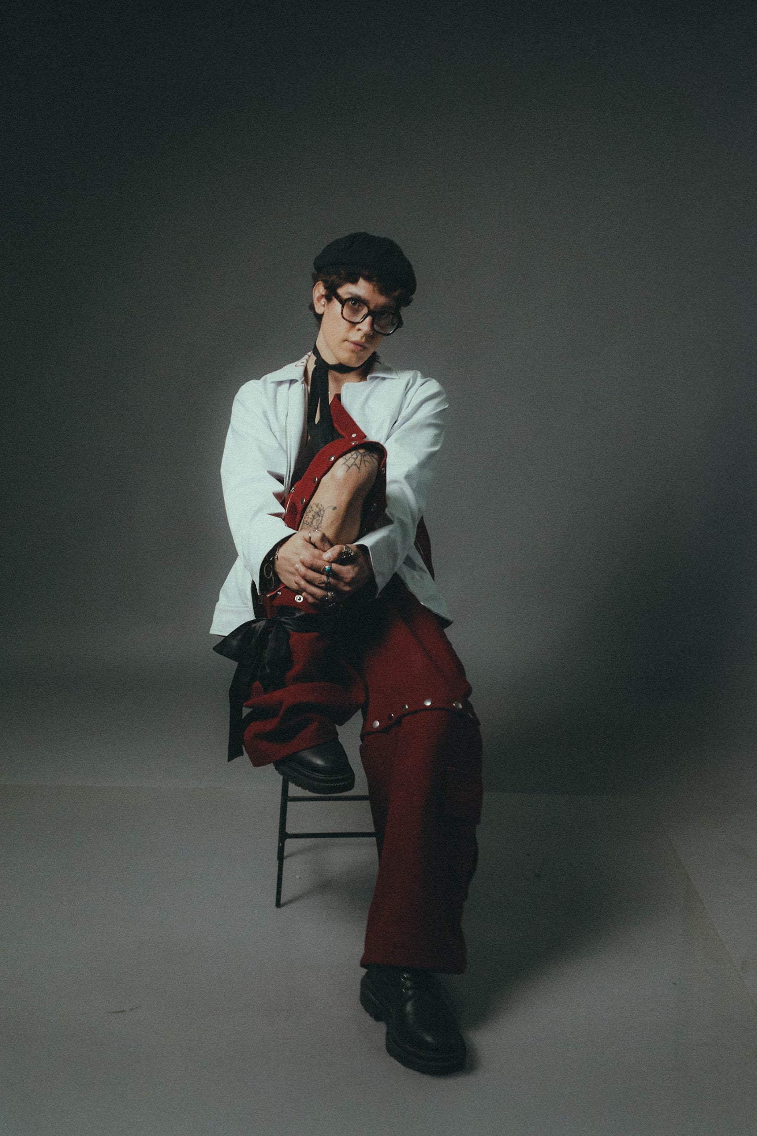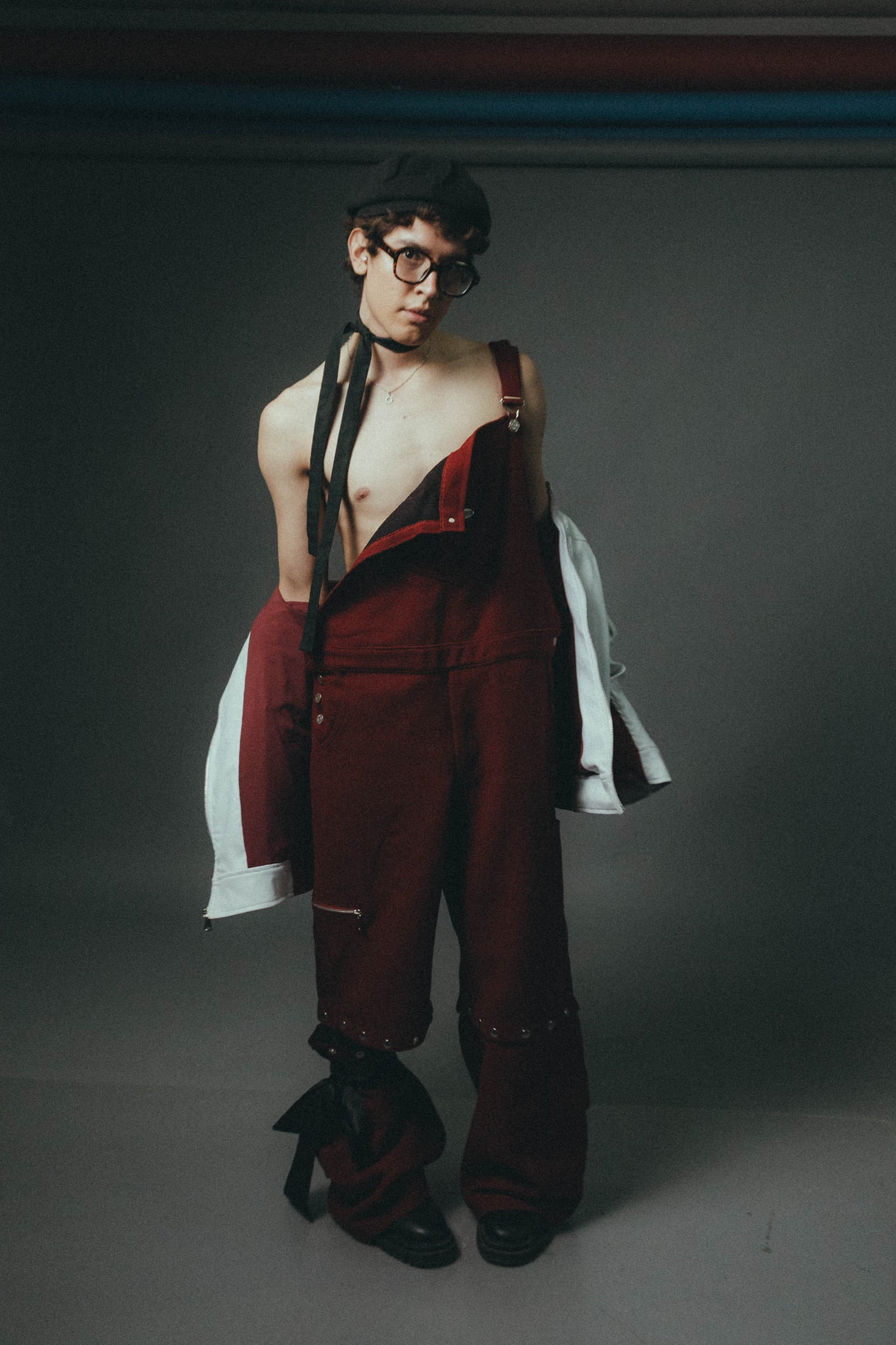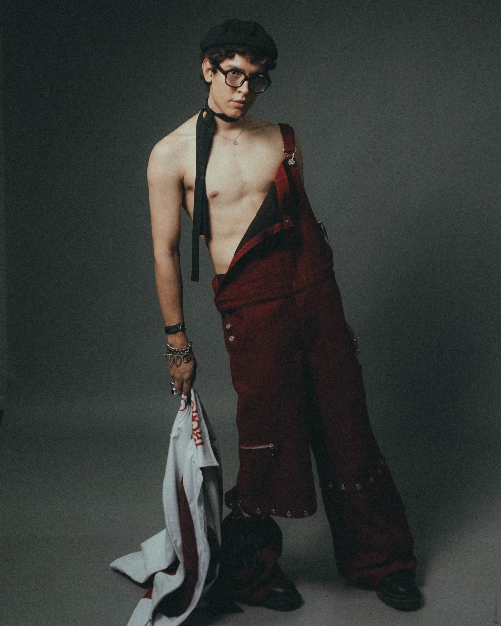 "El uniforme de castigo elevado a categoría de culto. Este diseño reinterpreta la ropa de trabajo industrial en una silueta carmesí de alta resistencia. La corbata fucsia y la camisa sleeveless marcan una jerarquía de hierro: es la indumentaria oficial del prefecto que no vigila el orden, sino que lidera la revuelta."