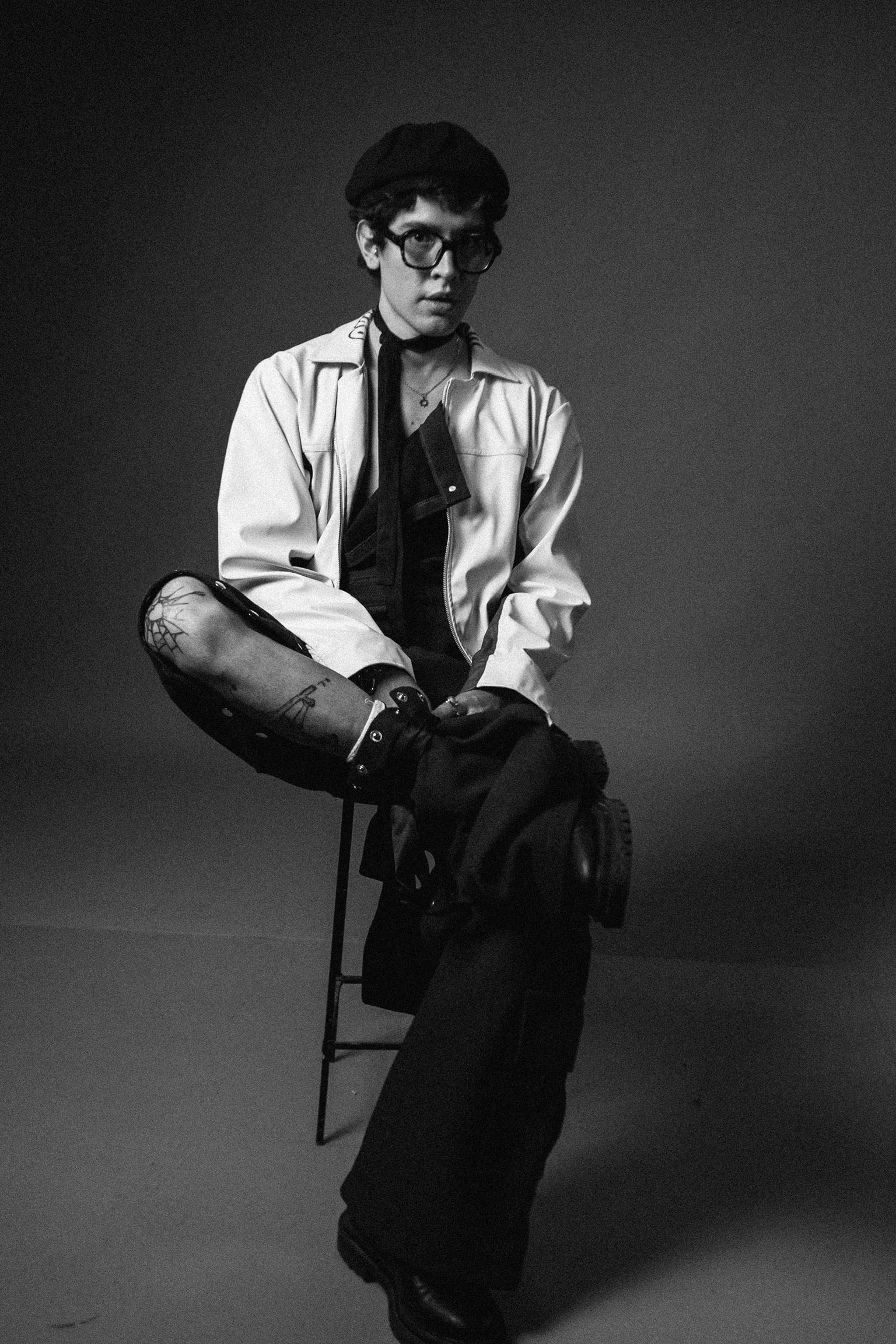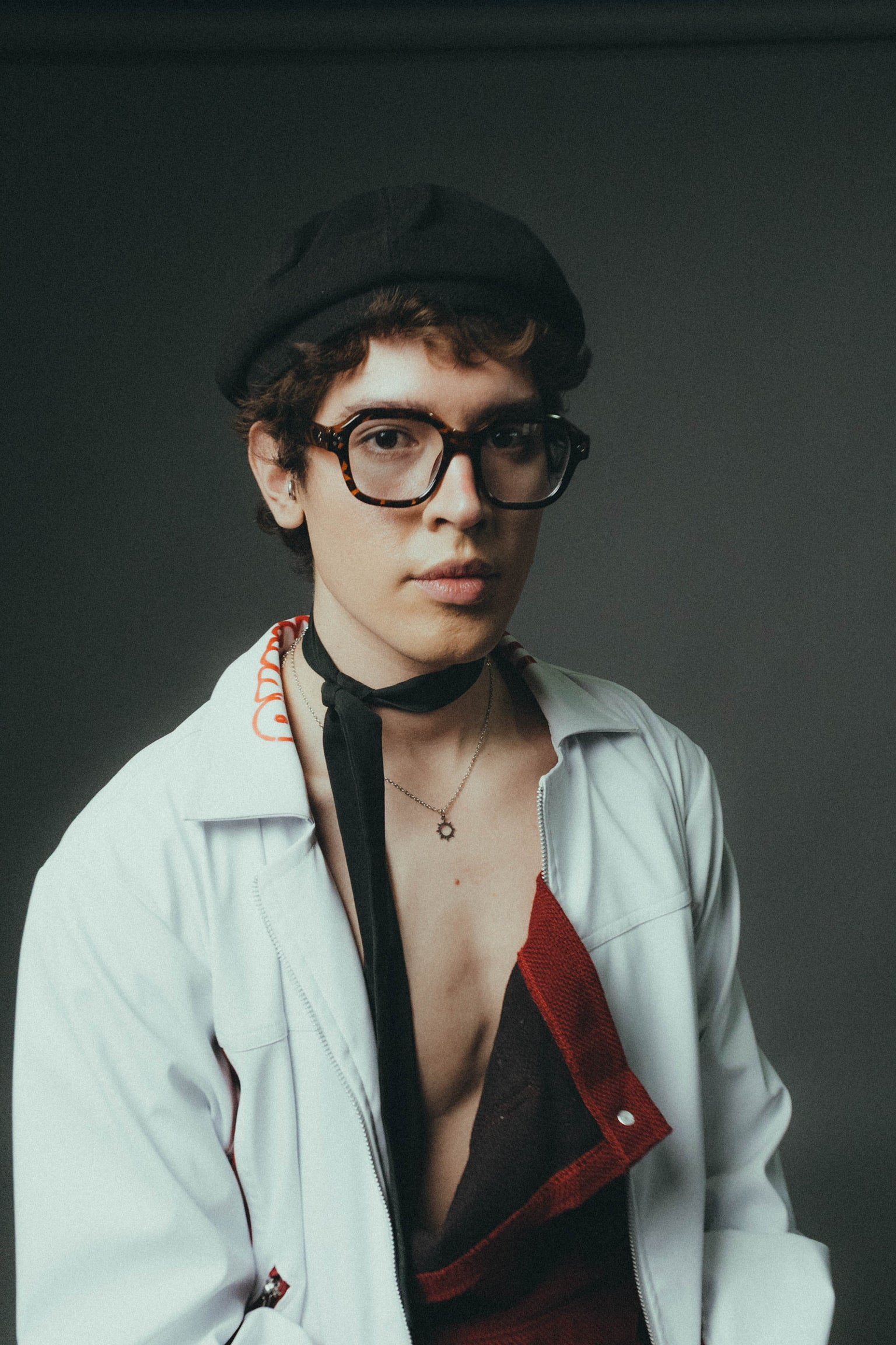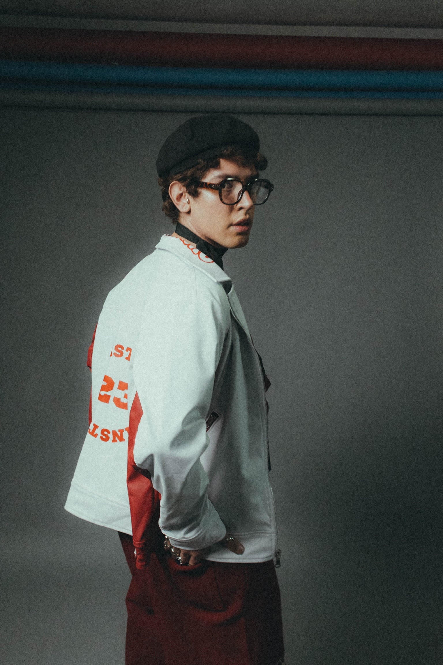 "El uniforme de castigo elevado a categoría de culto. Este diseño reinterpreta la ropa de trabajo industrial en una silueta carmesí de alta resistencia. La corbata fucsia y la camisa sleeveless marcan una jerarquía de hierro: es la indumentaria oficial del prefecto que no vigila el orden, sino que lidera la revuelta."